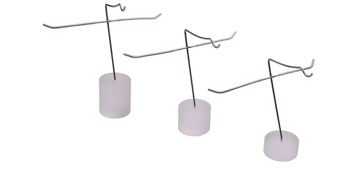 Individual display like a metal hanger with acrylic base in 3 heights. Metal/Frosted Acrylic Frame Display. Set of 3 PCS.