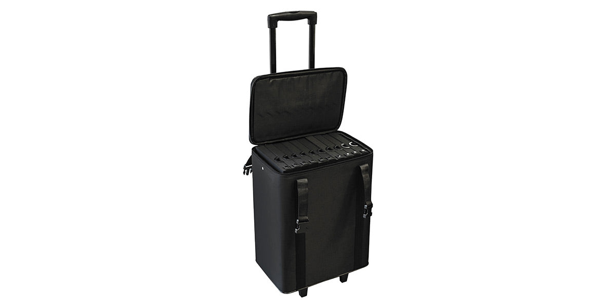 Small Trolley Luggage with wheels. Black color. Fabric & Stainless Steel materials. With 4 reinforced wheels and structure. Luggage Capacity: 10 Optical Trays or 6 Sun Trays. Tray Capacity: 12 Optical Pieces or 12 Sun Pieces. Total Capacity Pieces: 120 Optical Pieces or 72 Sun Pieces. Zipper with double sliders.