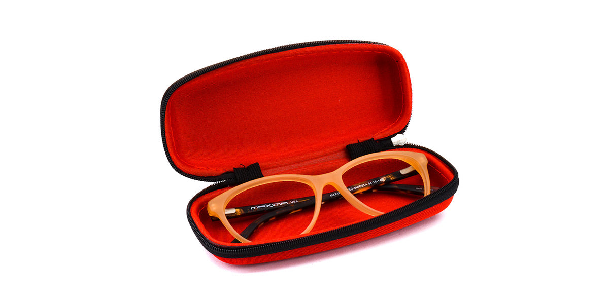 Semi-rigid optical case w/zipper. Red and black. Rectangular shape. Dimension: 6 x 3 in / 16 x 7 cm Weight: 1.50 oz / 42.52 g